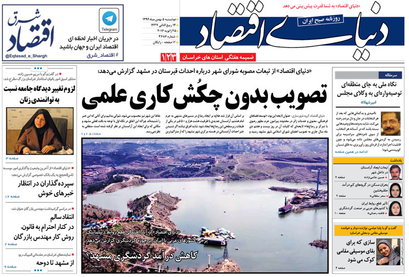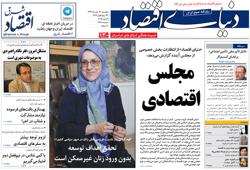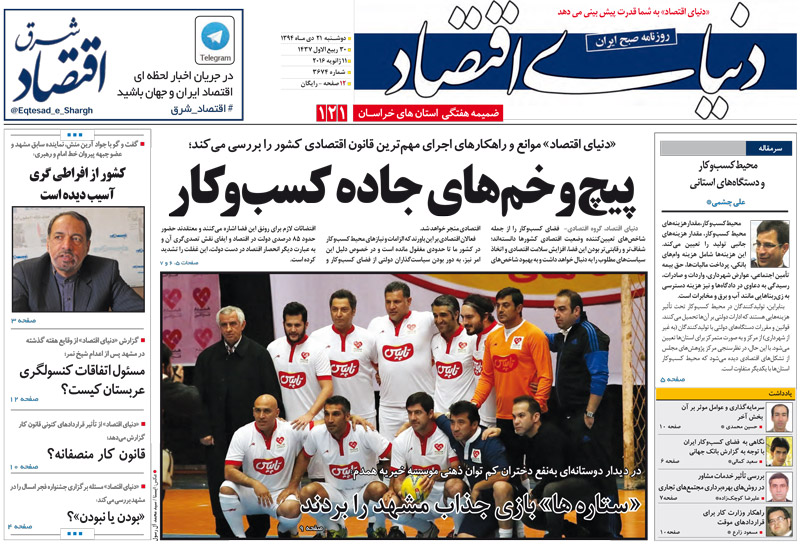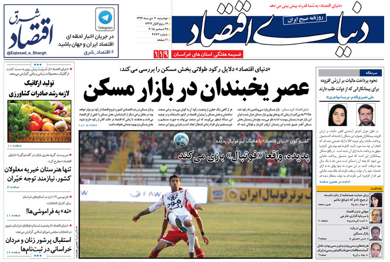 شماره 117 ضمیمه استان های خراسان/دوشنبه 23 آذر 1394 -در این شماره میخوانید: - «دنیای اقتصاد» از سرنوشت بازار خودرو پس از وام گزارش می دهد؛ بازگشت رکود؟ - «دنیای اقتصاد» از وضعیت تولید و صادرات پسته در خراسان رضوی گزارش می دهد: دومین قطب تولید پسته کشور - درگفت و گو با دو تن از معماران برنده جایزه معماری آسیا مطرح شد: بی توجهی به مقیاس های انسانی در معماری ایرانی- اسلامی -تاکید رئیس جمهور در سومین سفر خود به مشهد: همه چهره های علاقمند خدمت به مردم در صحنه انتخابات حاضر شوند -«دنیای اقتصاد» از تبعات تغییر نکردن نرخ نامه اتحادیه مشاوران املاک در مشهد گزارش می دهد: نارضایتی بنگاه داران -تلاش مسئولان بخش خصوصی؛ رونق ورزش در آغوش پیست شیرباد -و یادداشتهایی با عنوان: تکان های بعد از وام- حلقه گم شده در پسته کاری کشور- رانت دولتی و ناکارآمدی- حمایت از خودرو سازان داخلی باید محدود و مشروط باشد- انحصاری برای خودروهای کم کیفیت داخلی و امیر ارسلان نامدار بخش هفتم