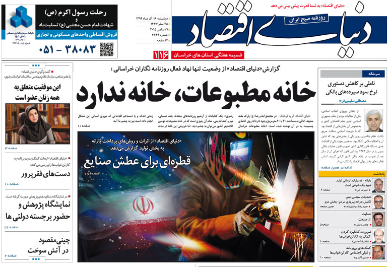 شماره 109 ضمیمه «دنیای اقتصاد» ویژه استان های خراسان/دوشنبه 27مهرماه 1394 -در این شماره می خوانید: -گزارشی از راهکارهای پرداخت بدهی خودروسازان به قطعه سازان: تحریک تقاضا -گزارش «دنیای اقتصاد» از جلسه شورای گفت و گوی دولت و بخش خصوصی با حضور ابتکار: قانون عوارض صنایع آلاینده اصلاح میشود -گفت وگو با غلامرضا انصاری؛ نماینده اسبق مشهد در مجلس و پاسخ های او به پرسشهایی درباره طرح ارمغان بهزیستی، کاهش تعداد اعضای شورای شهر، ترکیب شورای شهر، جزئیات بهره برداری از سد دوستی و ... - گفت و گو با یک کارشناس تئاتر کودک و نوجوان: از کشف نشدن استعداد کودک در مدرسه تا بزهکاری در جامعه - بررسی «دنیای اقتصاد» به بهانه کارتی شدن آب در خراسان رضوی: عابر بانک یا آبربانک؟! -گفت و گو با سریع ترین مرد ایران -یادداشتهایی با موضوع: صنعت خودرو سازی، نقش اقامتگاه در اکوتوریسم، اصلاح قانون تعداد اعضای شوراهای شهر در مشهد و ...