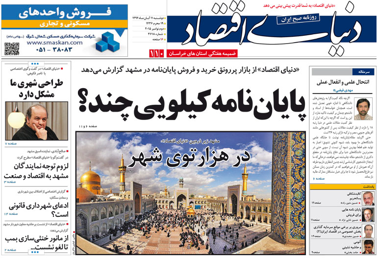 شماره 110 ضمیمه هفتگی استان های خراسان/دوشنبه4 آبان ماه 1394 -در این شماره میخوانید: -«دنیای اقتصاد» از وضعیت مالکان قولنامهای «پلاک 176 مشهد» گزارش میدهد: بلاتکلیفی 1+12 ساله -«دنیای اقتصاد» بررسی می کند: تعزیه؛ جلوه ای از فرهنگ ایرانی، گفت و گو با سید محسن مصطفی زاده،مدرس و پژوهشگر تعزیه و پاسخ های او به پرسش هایی درباره پیشینه تعزیه در ایران، شیوه بیان تعزیه، دلیل به انزوا رفتن تعزیه و تفاوت های آن با روضه خوانی و ... -گفت وگو با صادر کننده نمونه ملی و پاسخ های او به پرسشهایی درباره موفقیت در صادرات، چالش های پیش روی آن و الویت های امروز صادرات در کشور - گزارشی از عملکرد «سایت موزه در خراسان رضوی»: «سایت موزه ها» سازنده میراث فرهنگی کشور - در گفت و گوی «دنیای اقتصاد» با فعالان اقتصادی خراسان رضوی مطرح شد: شاه کلید دولت در پساتحریم؟ -افزایش درخواست های اروپاییان برای حضور در حرم رضوی -یادداشتهایی با عنوان: انقلاب اقتصادی ایران در سال94/ نقدی بر برنامه خروج از رکود اقتصادی دولت یازدهم/ «صادرات» کلید پیشرفت اقتصادی/ «بی نیاز» بیش از شغل خود به مهندسی ادبیات داستانی پرداخت