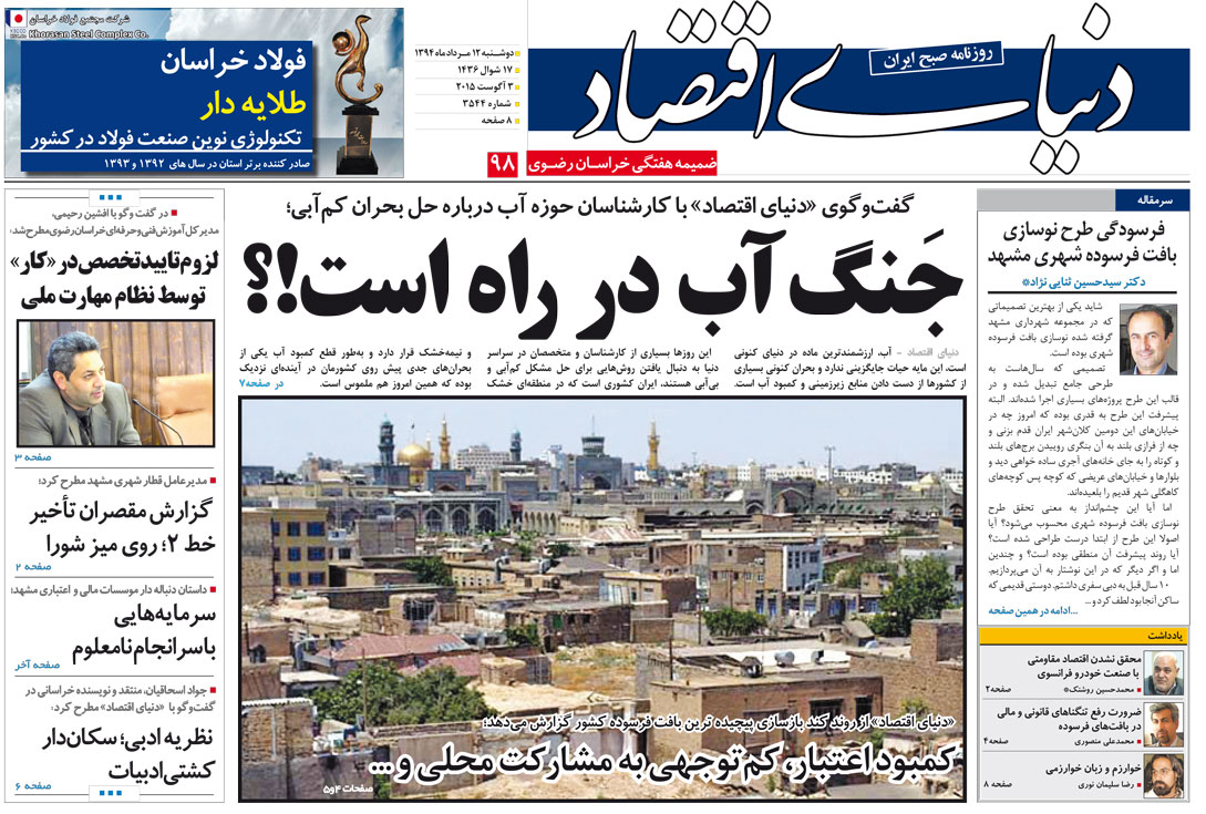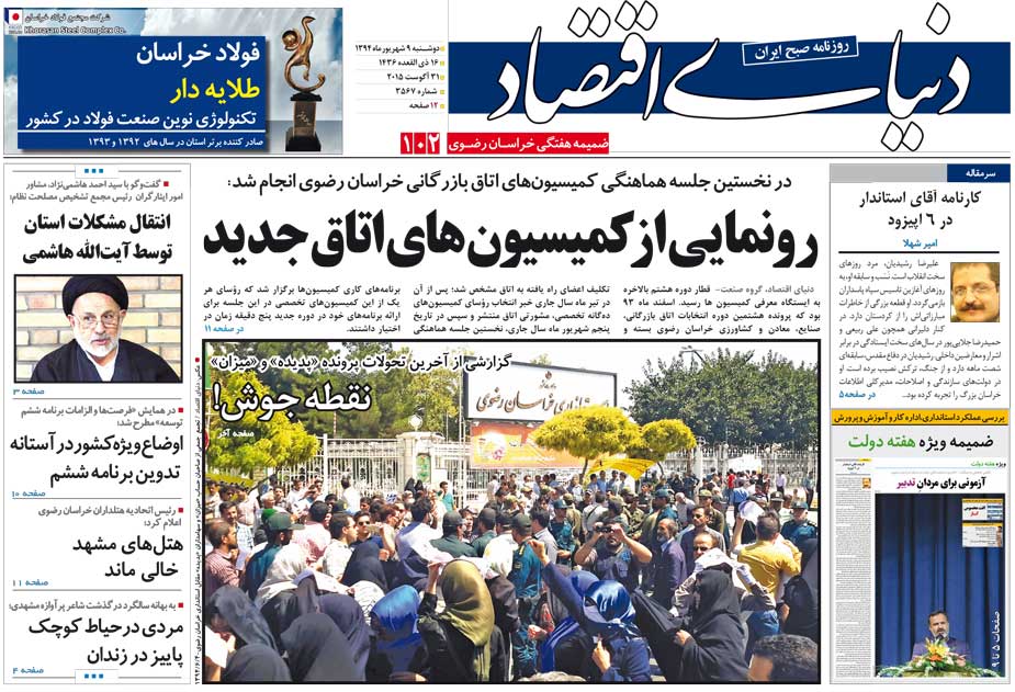 شماره 105 ضمیمه خراسان رضوی/ دوشنبه 30/6/1394 در این شماره می خوانید: - بررسی چالش های نظام مهندسی ساختمان در میزگرد «دنیای اقتصاد» با موضوع «انتخابات نظام مهندسی ساختمان» -گفت و گوی دنیای اقتصاد با مسئولان و کارشناسان تولید و صادرات زعفران خراسان رضوی: زعفران را در یابید ... - گفت و گویی صریح و متفاوت با برزو دبیریان، عضو شورای شهر مشهد و پاسخ های او به پرسش هایی درباره روند انتخابات هیات رئیسه شورای شهر، خودسانسوری شورای شهر، عملکرد شهرداری، رابطه دولت و شهرداری، عملکرد روزنامه شهرآرا -گزارشی میدانی از مهمترین ایستگاه راه آهن کشور در مشهد -دنیای اقتصاد به مناسبت روز شعر و ادب فارسی بررسی می کند: خراسان، آسمان پرستاره ادب فارسی