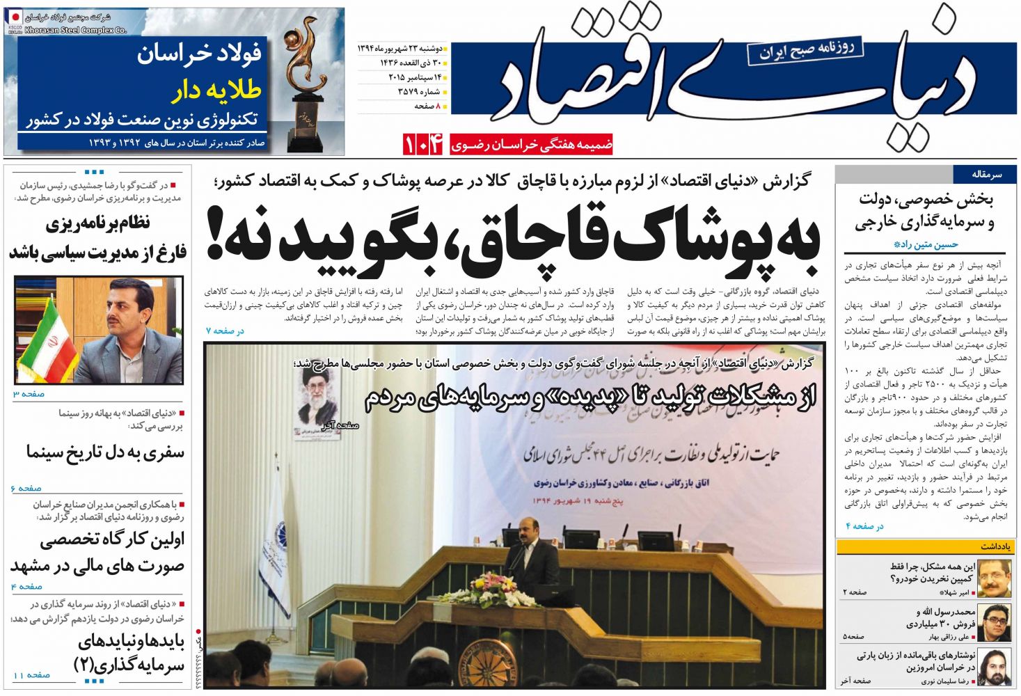 شماره 104 ضمیمه خراسان رضوی/ دوشنبه 23/6/1394 در این شماره می خوانید: - گزارشی از لزوم مبارزه با قاچاق کالا در عرصه پوشاک و کمک به اقتصاد کشور -گزارش «دنیای اقتصاد» از مشکلات تولید تا «پدیده» و سرمایه های مردم که در جلسه شورای گفت و گوی دولت و بخش خصوصی استان با حضور مجلسی ها مطرح شد. - گفت و گو با رضا جمشیدی، رئیس سازمان مدیریت و برنامه ریزی خراسان رضوی و پاسخ های او به پرسش هایی درباره میزان بودجه اعتباری ویژه ساماندهی کلان شهرها، میزان پیشرفت مصوبات دولت در سفر به استان، ارزیابی انحلال سازمان مدیریت و برنامه ریزی در دولت سابق. -برگزاری اولین کارگاه تخصصی صورت های مالی در مشهد با همکاری انجمن مدیران صنایع خراسان و روزنامه دنیای اقتصاد -دنیای اقتصاد به بهانه روز سینما بررسی می کند: سفری به دل تاریخ سینما