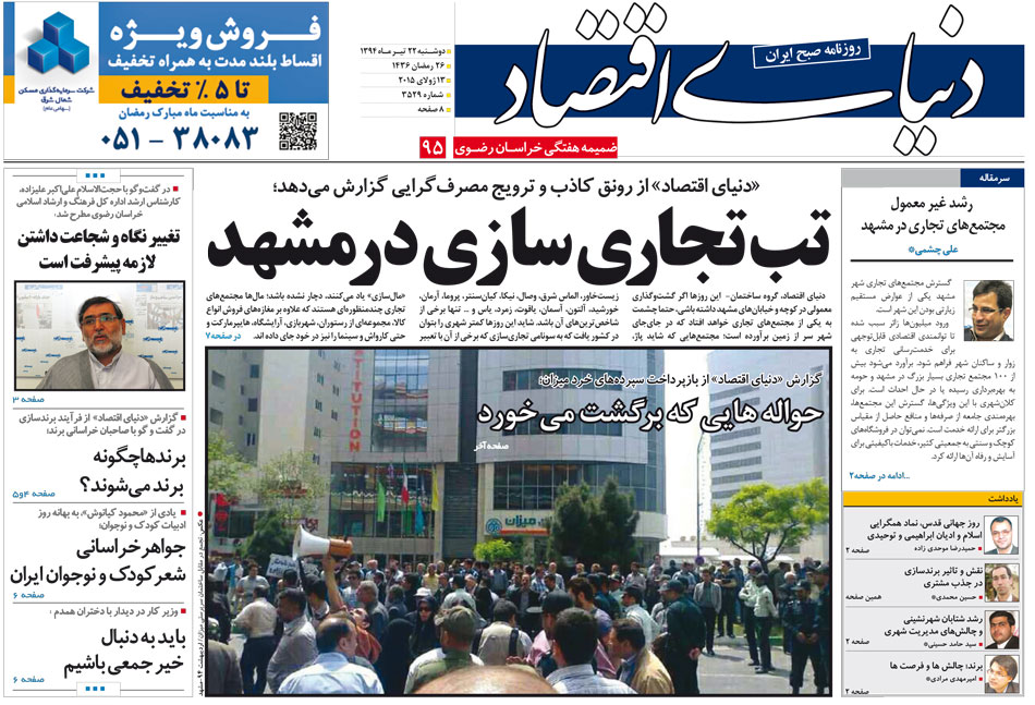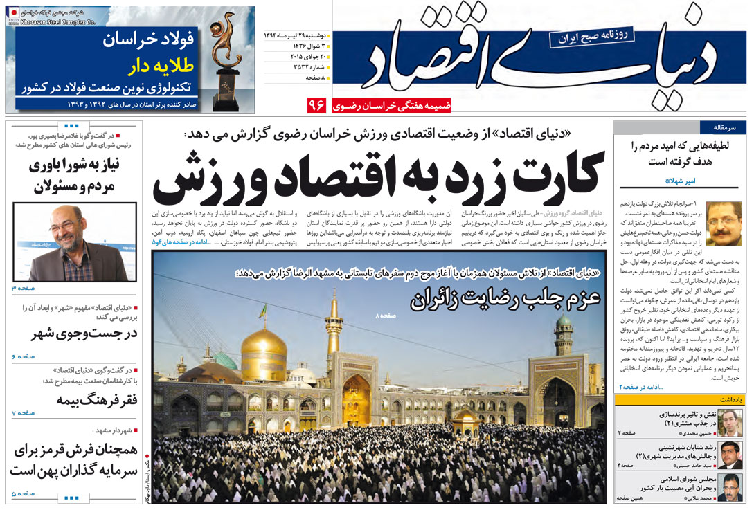 در این شماره می خوانید: - در گفت و گوی «دنیای اقتصاد» با فعالان عرصه خانگی مطرح شد : بازاریابی و فروش؛ معضل مشاغل خانگی - گزارش «دنیای اقتصاد» از تاثیر پارک های آبی در جذب گردشگر: نقش پارک های آبی در ماندگاری بیشتر زائران -سرمقاله به قلم سید حسین ثنائی نژاد: زائران حرم رضوی، آب و جاذبه های گردشگری - در گفت و گو با سید حسین رسولی دبیر اجرایی خانه کارگر استان خراسان رضوی: لزوم درک متقابل نیازها میان کارگر و کارفرما - گزارشی از اجرای طرح اذان تا اذان در سینماهای مشهد : سیمرغ و پیروزی؛ مجریان تازه افطار تا سحر - بررسی ضرورت توجه ویژه به هدر رفت شدید آب در بخش کشاورزی : فوریت اجرای روش های پیشرفته آبیاری در بخش کشاورزی