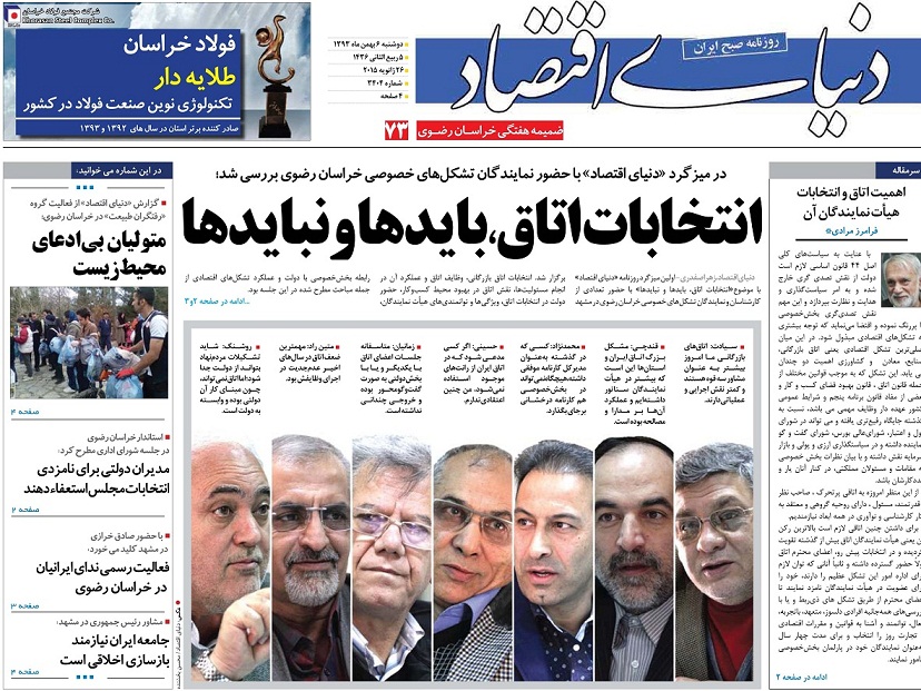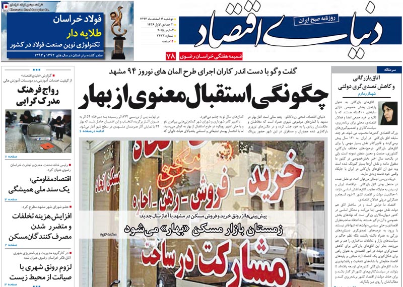 در این شماره می خوانید: - گفت و گو با دست اندرکاران اجرای طرح المان های نوروز 94 : چگونگی استقبال معنوی از بهار - پیش بینی ها از رونق خرید و فروش مسکن در مشهد با آغاز سال جدید : زمستان بازار مسکن «بهار» می شود -سرمقاله به قلم شهناز رمارم : اتاق بازرگانی و کاهش تصدی گری دولتی -گزارش «دنیای اقتصاد» از کیفیت خدمات آموزشی در موسسات آموزش عالی : رواج فرهنگ مدرک گرایی -رئیس خانه صنعت، معدن و تجارت خراسان رضوی عنوان کرد : اقتصاد مقاومتی، یک سند ملی همیشگی