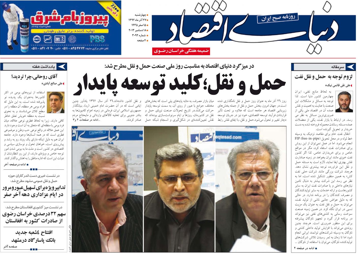در این شماره می خوانید: -در میزگرد دنیای اقتصاد به مناسبت روز ملی صنعت حمل و نقل مطرح شد : حمل و نقل؛ کلید توسعه پایدار -سرمقاله به قلم علی نقی قائمی نیک : لزوم توجه به حمل و نقل نفت -یادداشت هفته به قلم علی صالح آبادی : آقای روحانی، چرا تردید؟