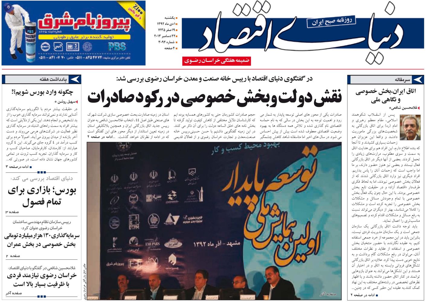 در این شماره می خوانید: -در گفت و گوی دنیای اقتصاد با رییس خانه صنعت و معدن خراسان رضوی : نقش دولت و بخش خصوصی در رکود صادرات - دنیای اقتصاد بررسی می کند : بورس بازاری برای تمام فصول -سرمقاله به قلم غلامحسین شافعی : اتاق ایران، بخش خصوصی و نگاهی ملی -یادداشت هفته به قلم سهیل روشن: چگونه وارد بورس شویم