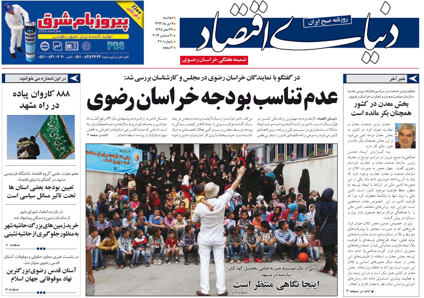 در این شماره می خوانید: -در گفت و گو با نمایندگان خراسان رضوی در مجلس و کارشناسان بررسی شد : عدم تناسب بودجه خراسان رضوی - گزارشی از یک موسسه خیریه حامی تحصیل کودکان نیازمند در مشهد : اینجا نگاهی منتظر است -عضو هیات علمی گروه اقتصاد دانشگاه فردوسی مشهد در گفت و گو با دنیای اقتصاد : تعیین بودجه بعضی استان ها تحت تاثیر مسائل سیاسی است -88 کاروان پیاده در راه مشهد