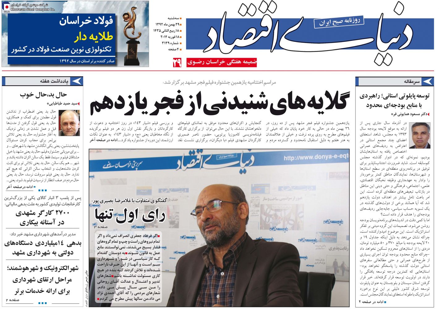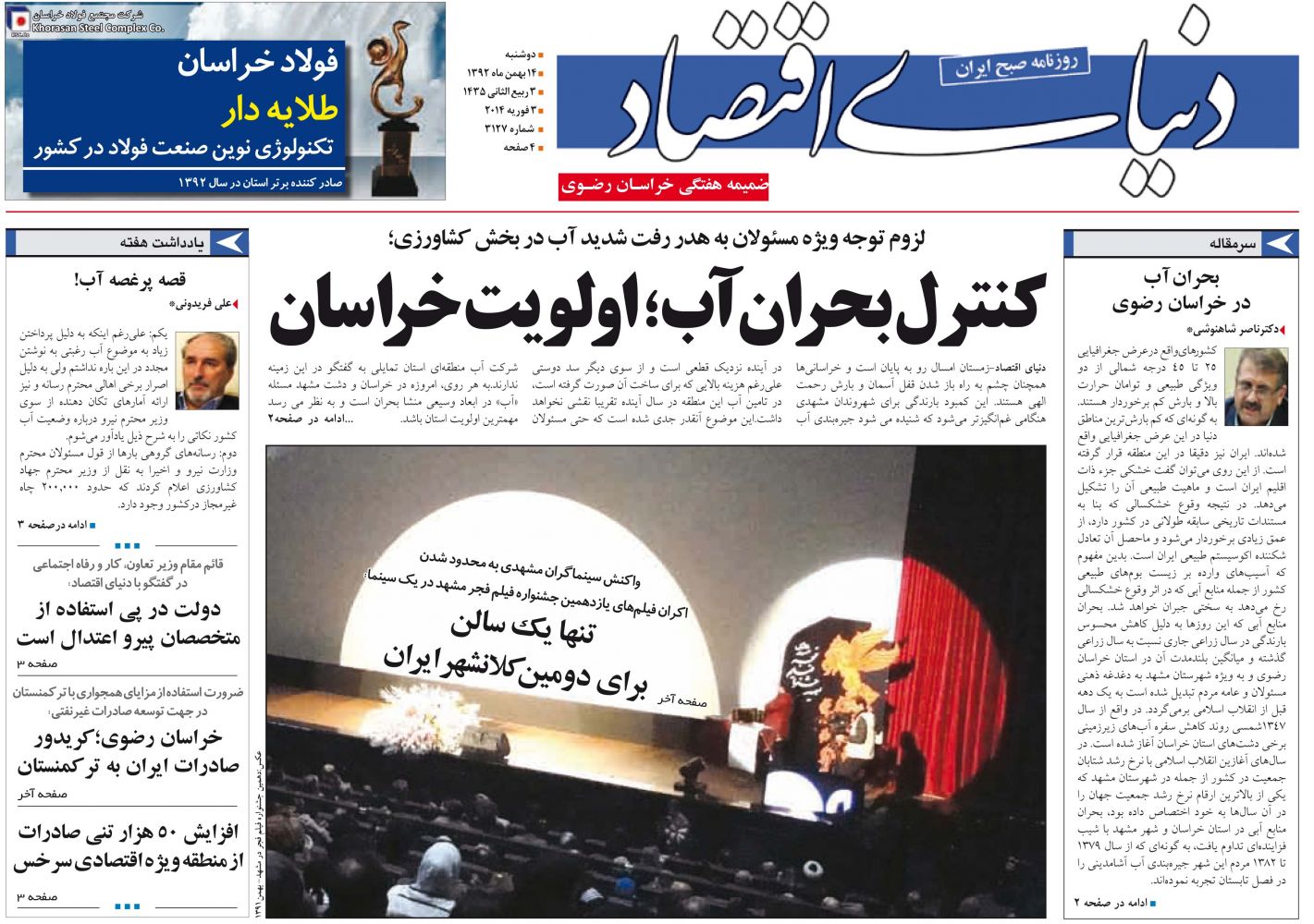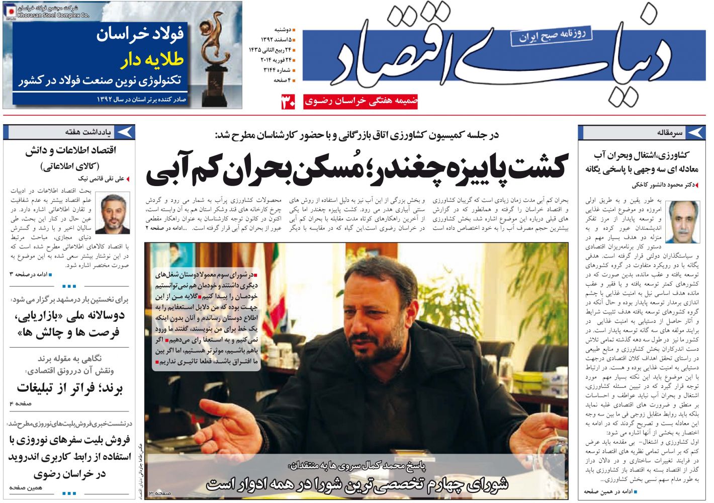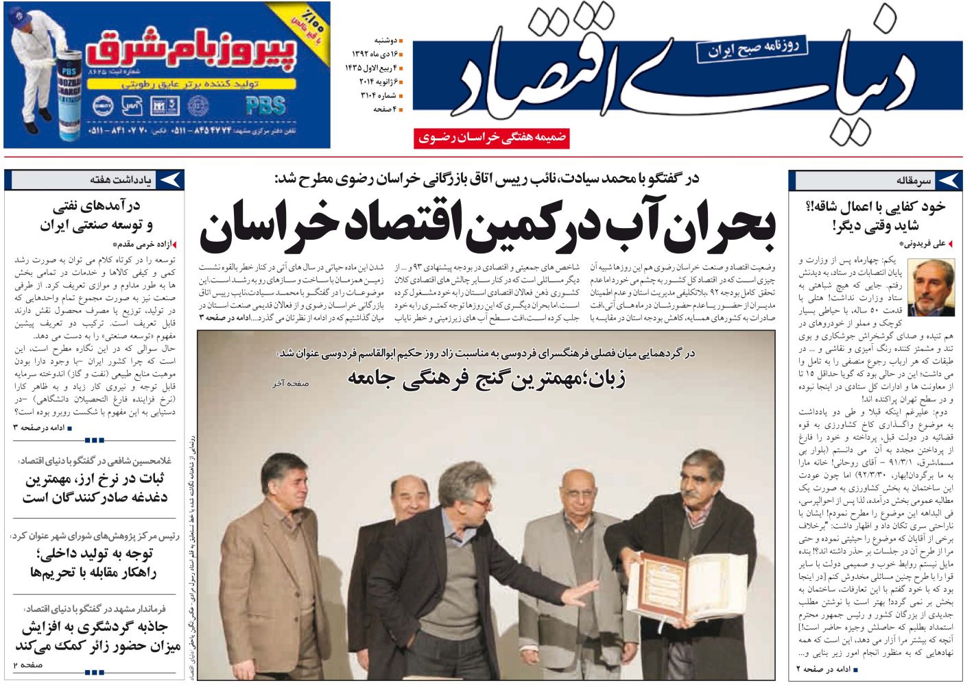 در این شماره می خوانید: -در گفت و گو با محمد سیادت، نایب رییس اتاق بازرگانی خراسان رضوی مطرح شد : بحران آب در کمین اقتصاد خراسان - در گردهمایی میان فصلی فرهنگسرای فردوسی به مناسبت زادروز حکیم ابوالقاسم فردوسی عنوان شد : زبان مهم ترین گنج فرهنگی جامعه -سرمقاله به قلم علی فریدونی : خودکفایی با اعمال شاقه ؟! شاید وقتی دیگر -غلامحسین شافعی در گفت و گو با دنیای اقتصاد: ثبات در نرخ ارز، مهم ترین دغدغه صادر کنندگان است -فرماندار مشهد در گفت و گو با دنیای اقتصاد: جاذبه گردشگری به افزایش میزان حضور زائر کمک می کند