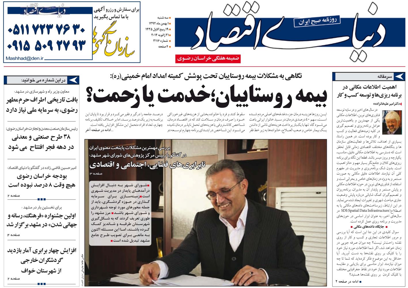 در این شماره می خوانید: -نگاهی به مشکلات بیمه روستاییان تحت پوشش کمیته امداد امام خمینی (ره) : بیمه روستاییان؛ خدمت یا زحمت؟ - بررسی مهم ترین مشکلات پایتخت معنوی ایران در گفت و گو با رییس مرکز پژوهش های شورای شهر مشهد : نا برابری های فضایی، اجتماعی و اقتصادی -سرمقاله به قلم دکتر امیر علیخانزاده : اهمیت اطلاعات مکانی در برنامه ریزی ها و توسعه کسب و کار -رئیس سازمان صنعت، معدن و تجارت خراسان رضوی خبر داد: 38 طرح صنعتی و معدنی در دهه فجر افتتاح می شود