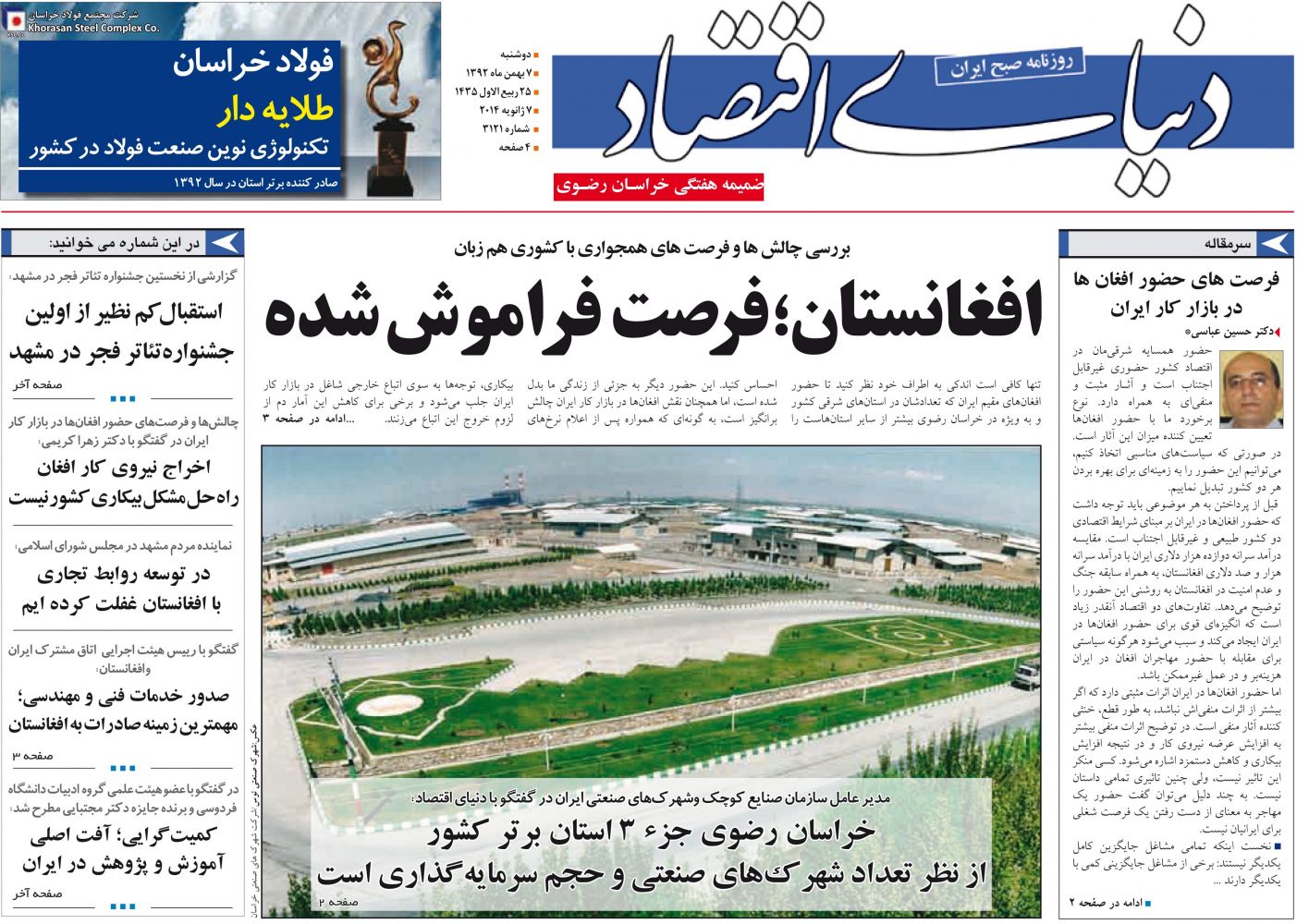 در این شماره می خوانید: -بررسی چالش ها و فرصت های همجواری با کشوری هم زبان : افغانستان؛ فرصت فراموش شده - مدیر عامل سازمان صنایع کوچک و شهرک های صنعتی ایران در گفت و گو با دنیای اقتصاد : خراسان رضوی جزء 3 استان برتر کشور از نظر تعداد شهرک های صنعتی و حجم سرمایه گذاری است -سرمقاله به قلم دکتر حسین عباسی : فرصت های حضور افغان ها در بازار کار ایران -نماینده مردم مشهد در مجلس شورای اسلامی: در توسعه روابط تجاری با افغانستان غفلت کرده ایم