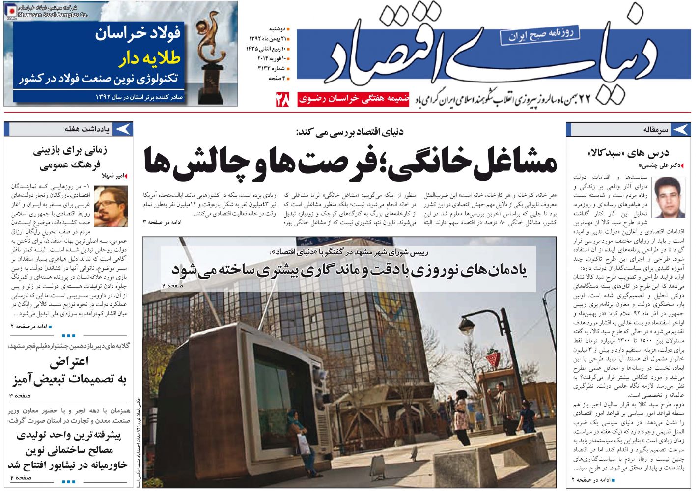 در این شماره می خوانید: -دنیای اقتصاد بررسی میکند : مشاغل خانگی؛ فرصت ها و چالش ها - رئیس شورای شهر مشهد در گفت و گو با «دنیای اقتصاد» : یادمان های نوروزی با دقت و ماندگاری بیشتری ساخته می شود -سرمقاله به قلم دکتر علی چشمی : درس های «سبد کالا» -یادداشت هفته به قلم امیر شهلا: زمانی برای بازبینی فرهنگ عمومی