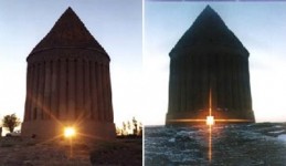معمار بنا، دو دیوار موازی از 12 دیوار اولیه این برج را در راستای نصفالنهار ساختهاند و راستای درها هم در امتداد طلوع زمستان و غروب تابستان است. جایی در پهنه برج که میتوان با توجه به آنها چهار فصل، سال کبیسه و آغاز نوروز را تعیین کرد. در حقیقت این درها طوری تعبیه شدهاند که پس از حرکت 60درجهای خورشید در افق، نور خورشید از دو در میگذرد و طلوع، آغاز زمستان و غروب، آغاز تابستان در افق برج دیده میشود. این راستاها پیش از بنای برج طراحی شده و اگر زمانی دیدید که طلوع از میان درها دیده میشود و به اوج جابهجایی خود میرسد، باید بدانید که یلدا گذشته و آن روز شروع زمستان و دی ماه است. این کارکرد باعث شده که برخی کارکرد برج را صرفا نجومی بدانند چرا که در این دو تصویر میتوانید طلوع یلدایی و غروب تابستانی ببینید. نور خورشید طوری میتابد که از میان دو در عبور کرده و در نتیجه زمان دقیق شروع این دو فصل را معین میکند. تصویر راست مربوط به شروع زمستان و تصویر چپ مربوط به شروع تابستان است.(عکس در پایین مطلب اضافه شده است)