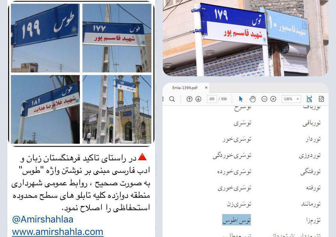 خبر از جایگزینی تابلوهای «توس» با «طوس» آمده بود. کاری که شهرداری منطقه ۱۲ انجام داده است. جز اینکه این کار مصداق اتلاف و حیف سرمایهی اندک و دیریاب شهرداری (و البته بیتالمال) است؛ استدلال انجامشده و پیشکشیدن پای فرهنگستان هم بسیار سست است. تازهترین نسخهی فرهنگ املایی فرهنگستان زبان (تصویر پایین راست) توس را جزء واژگان دواملایی آورده است و هر دو صورت نوشتاری را پذیرفته است و سفارش کرده است که صورت رایجتر (توس) به کاربرده شود. در جای دیگری چنین توضیح داده شده است: «توس/ طوس؛ توسى/ طوسى؛