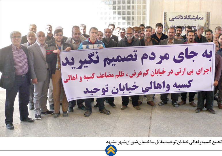 نیمه شب هفتة گذشته، ماموران شهرداری دو لاین از چهار لاین خیابان توحید مشهد را برای افتتاح خط 3 بی.آر. تی نرده میکشند. صبح آن روز یعنی اول آذرماه، کسبة منطقه از فروشندگان ابزارآلات و پوشاک گرفته تا فروشندگان خواروبار به نشانة اعتراض در مقابل ساختمان شورای شهر تجمع میکنند. بنر بزرگی را در دست گرفتهاند که روی آن نوشته شده: «به جای مردم تصمیم نگیرید، اجرای بی.آر.تی در خیابان کم عرض، ظلم مضاعف است به کسبه و اهالی»