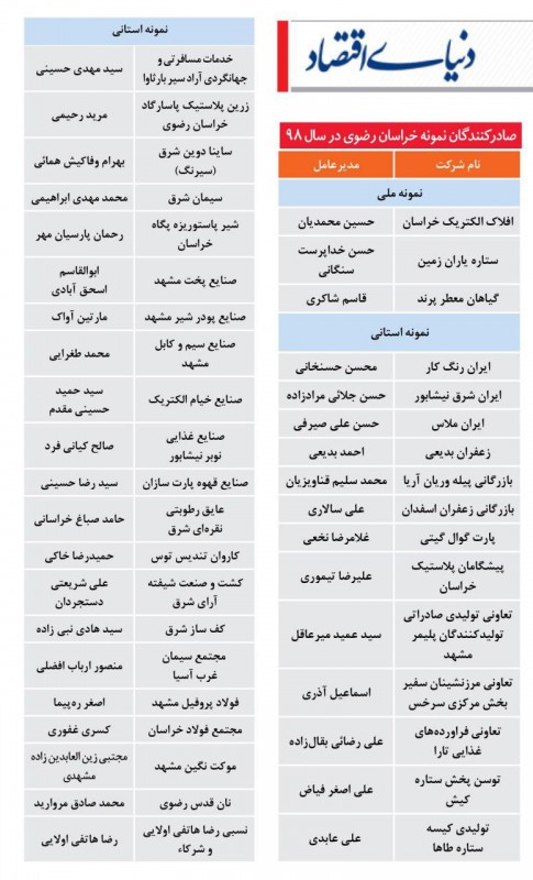 رحمانی نقبی هم به آمار صادرات کشور و خراسان رضوی در 10 ماهه اول امسال زد و گفت: در این مدت صادرات کشور روند افزایش وزنی 18 درصدی را پشت سر گذاشته و این درحالیست که صادرات خراسان رضوی در این مدت 21 درصد افزایش وزنی داشته است. وی ادامه داد: البته نه فقط صادرات بلکه تولید کشورمان هم افزایشی بوده است؛ ما حدود 44 قلم کالا را به عنوان محصول منتخب می دانیم و در وزارتخانه به طور ماهانه وضعیت آن ها را رصد می کنیم؛ طبق بررسی های ما در 10 ماهه، بیش از دو سوم این کالاها نسبت به مدت مشابه پارسال دارای روندی افزایشی بوده است.