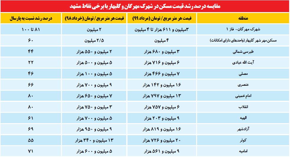 قیمت مسکن مهر مهرگان به طور میانگین از هر متر مربع 2 میلیون تومان در سال گذشته به 3 میلیون و 611 هزار تومان در بهار سال جاری و برای برخی از واحدها با امکاناتی بیشتر تا 4 میلیون تومان افزایش یافته است؛ این یعنی افزایش 80 تا 100 درصدی قیمت! درحالیکه افزایش قیمت این بازه زمانی در طبرسی شمالی به عنوان یکی از مناطق نسبتا نزدیک به حرم رضوی 44 درصد و منطقه آیت الله عبادی 22 درصد بوده است. رشد قیمت مسکن در منطقه مصلی و عنصری هم به ترتیب 46 و 66 درصد بوده است.